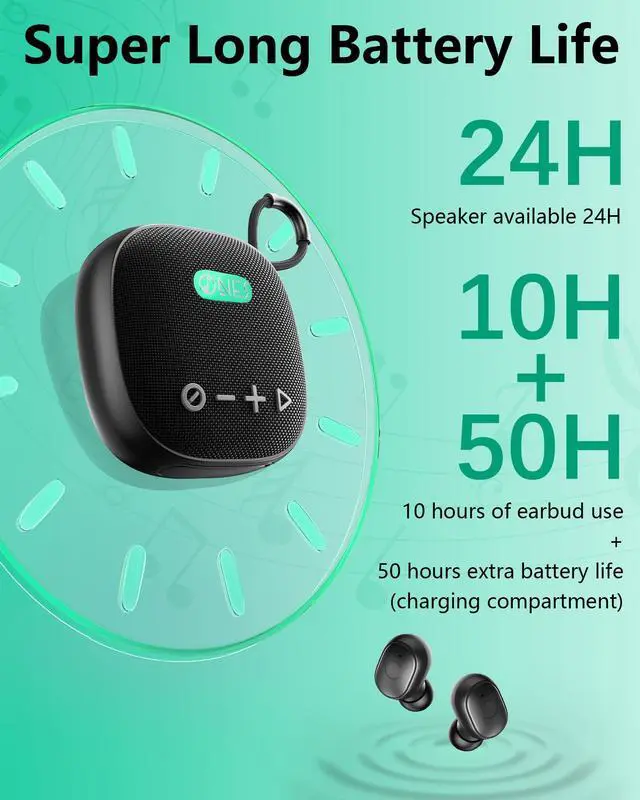 Versatile Portable Design Innovative 2-in-1 device combining a bluetooth wireless Speaker and Earbuds for maximum convenience. 993cm Compact, portable, lightweight construction makes it easy to take your music and calls on the go. ^^ Ultra-Long Battery Life Speaker lasts up to 24 hours, earphones up to 10 hours. Charging case provides 50 extra hours for earphones, totaling 60 hours. ^^ Smart Multifunctional The wireless speaker and wireless earbuds can be connected to separate devices. Speaker supports Bluetooth wireless, AUX wired input, FM radio ( Please connect the included AUX/USBC cable as an antenna )