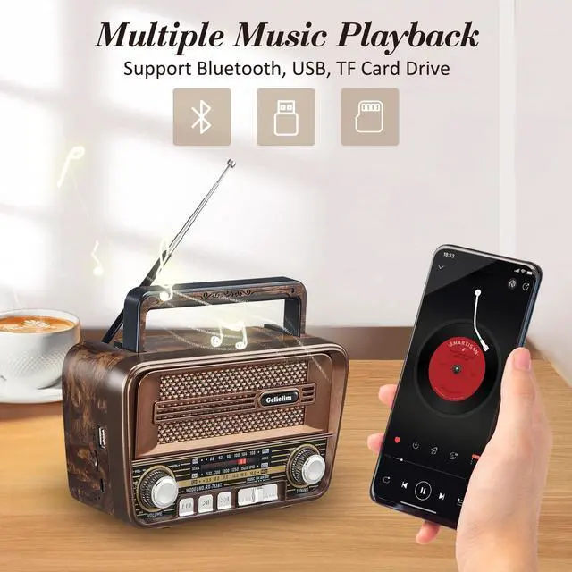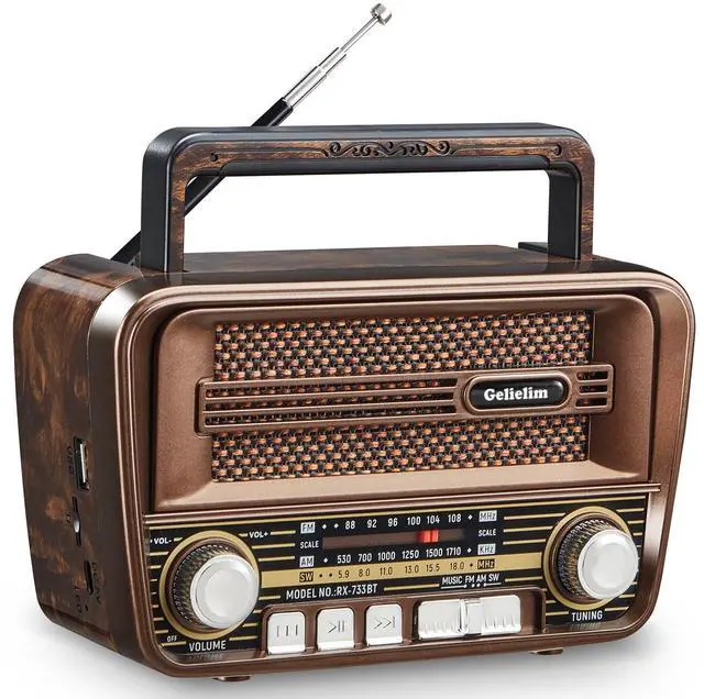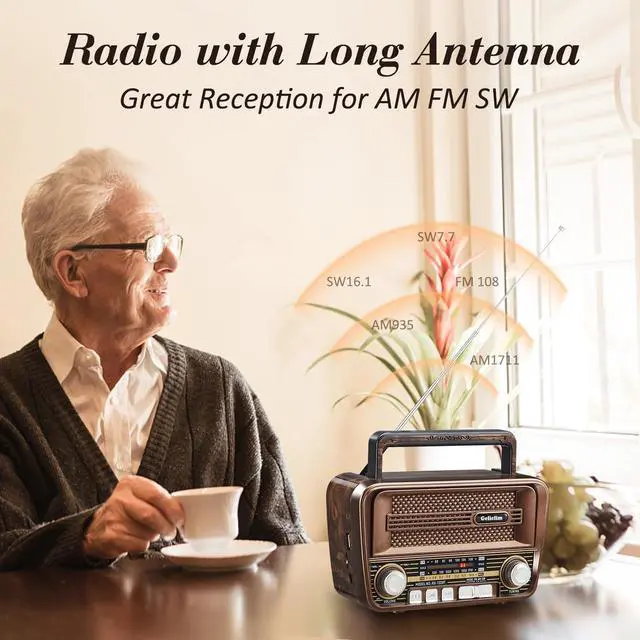[RETRO RADIO WITH GREAT RECEPTION] - Gelielim portable radio supports 3-band radio: FM 88-108 MHz, AM 530-1710KHz, and Short Wave 5.9 - 18.0MH z, which covers most radio channels. The powerful DSP chip and long retractable antenna ensure excellent reception, allowing you to listen to the radio anytime and anywhere ^^ [BLUETOOTH/USB/TF PLAYING] - Turn to the "Music" mode, the vintage radio supports 3 ways to play music or audiobooks. With advanced Bluetooth 5.3 technology, the retro Bluetooth speaker is compatible with most phones, tablets, and laptops. USB drive and TF card playback are also available, plug and play, no complicated operation ^^ [BATTERY POWERED RADIO] - The portable radio features a built-in 1200mAH rechargeable battery, make sure it has enough power for picnics, walking, climbing, or gardening. It also comes with a DC 5V Type C charging cable NOT AC power cable, you can use the radio in the kitchen, bedroom, or office while charging.