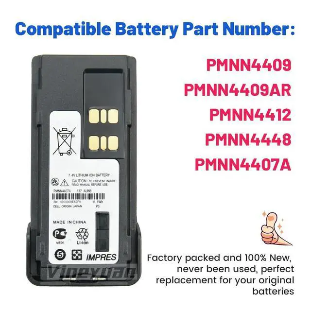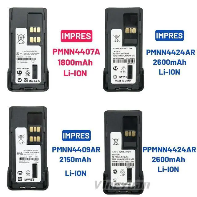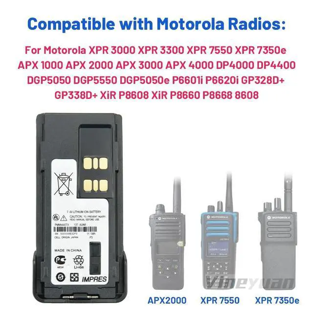 Battery SpecsCapacity: 1800mAh, Type: Li-ion, Voltage: 7.4V, Weight: 151g/ 5.32 oz/ 0.33 lb/pcs, Material: Batteries are made with the highest quality materials ^^ Compatible with Motorola Two Way RadiosFor Motorola Radios XPR 3000 XPR 3300 XPR 3500 XPR 7350 XPR 7380 XPR 7550 XPR 7580 XPR 3500e XPR 7350e XPR 7380e XPR 7550e XPR 7580e and APX 1000 APX 2000 APX 3000 APX 4000 and DP4000 DP4400 DP4600 DP4601 DP4800 DGP5050 DGP5550 DGP5050e DGP5550e DGP8050 GP328D GP338D GP328D+ GP338D+ P6601i P6620i XiR P8608 XiR P8660 P8668 8608 ^^ Compatible Battery Part NumberPMNN4409 PMNN4409AR PMNN4412 PMNN4448 PMNN4407A ^^ PAY ATTENTION PLEASEAll IMPRES battery need to use up the battery power at first, then install to the radio and charged full to active the battery!