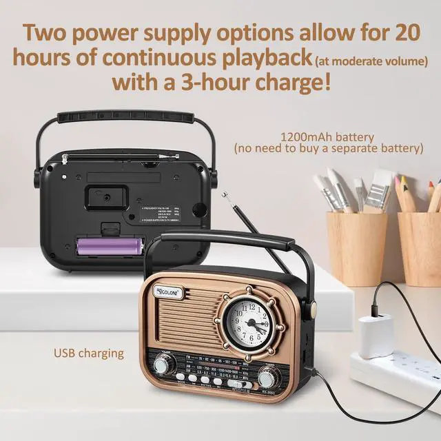 A perfect blend of nostalgic aesthetics and modern tech. ^^ [Classic Radio with Knobs for Easy Tuning] Designed with simple, large tuning knobs and a clear, easy-to-read frequency dial, making it extremely intuitive to operate. It is a perfect, user-friendly gift for seniors, parents, and grandparents who prefer traditional, straightforward controls over complicated modern buttons. ^^ [Rechargeable Battery Operated & Portable] Equipped with a built-in 1200mAh rechargeable battery, this radio provides 68 hours of continuous listening on a single charge. Easily recharge it via the included USB cableno need to constantly replace dry batteries.