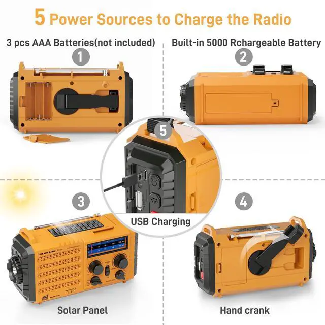 The crank radio has a comprehensive coverage of entertainment, sports, news or overseas broadcast like The BBC/Moscow/Beijing. The telescopic antenna makes it a portable radio with best reception. Big volume knob is designed for easy volume adjustment and the 3.5 mm headphone jack for your enjoying radio shows privately. ^^ 5 Power Sources-Long RuntimeThis is ready and save your life in emergency. Built-in 5000 rechargeable battery, the is easily recharged by solar/hand crank/power plug( 5V/2A, not included)and USB cord (included). Besides, it is also equipped with backup battery compartment(3pcs*AAA batteries, not included).