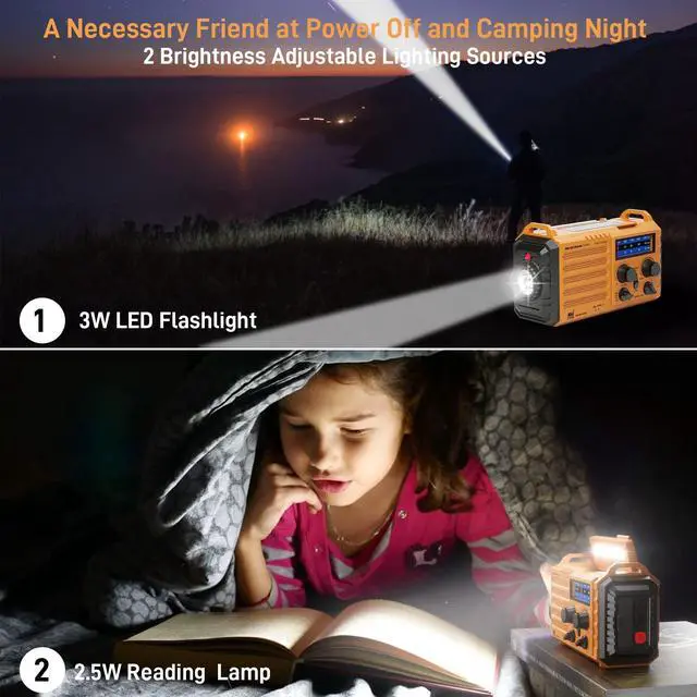 No more power failure concerns in any situation. The full charged solar radio will last up to 13 hours only playing FM radio. ^^ All-in-One Portable Radio with LED Flashlight/Reading LampOur is also designed for outdoor survival- provides 2 light sources. The side 3W LED flashlight provides strong and straight light to light up 80 meters away. A very vital survival gear and equipment if you are lost at night. 2.5W Reading Lamp with 2 adjustable brightness- Flipping up the solar panel makes the emergency crank radio a reading lamp with 6 built-in LED bulbs to illuminate 20 room or campsite.