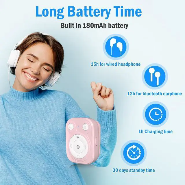 Sports & Compact: The upgraded non-slip clip securely attaches to clothing during running, gym workouts, or cycling. The sports MP3 player weighs only 0.55 ounces ( 15.8 g) and sizes 1.31 (L) x 0.78 (W) x 1.69 inches (H), making it as compact as a matchbox and virtually unnoticeable. Its cute design complements most outfits ^^ 15 Hours Long Playback & Fast Type-C: This portable MP3 player can play continuously for 12-15 hours at medium volume with wired headphones, or 10-12 hours with headphones in Bluetooth mode. It takes only 1 hour to fully charge ^^ Bluetooth 5.3