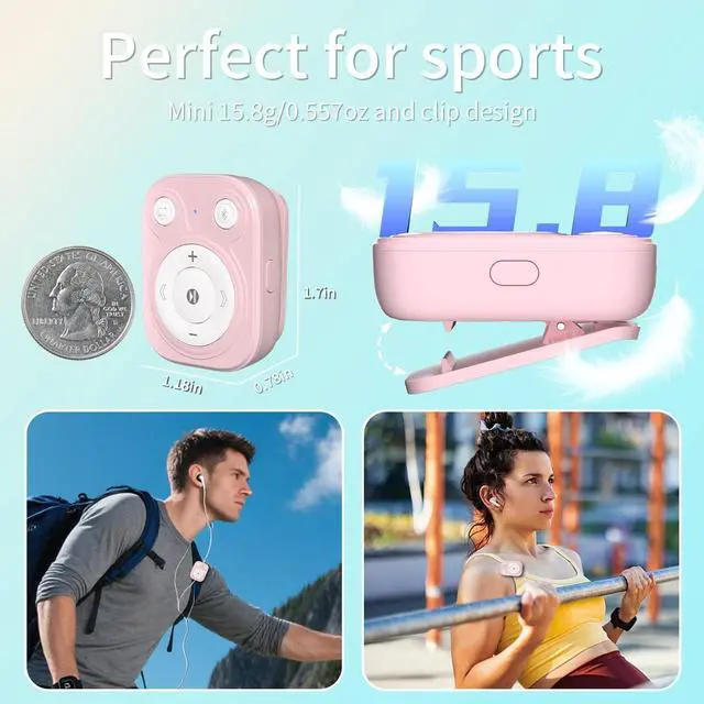 • Perfect for Sports & Compact: The upgraded non-slip clip securely attaches to clothing during running, gym workouts, or cycling. The sports MP3 player weighs only 0.55 ounces (15.8g) and sizes 1.31(L) x 0.78(W) x 1.69 inches(H), making it as compact as a matchbox and virtually unnoticeable. Its cute design complements most outfits