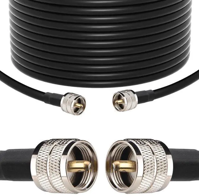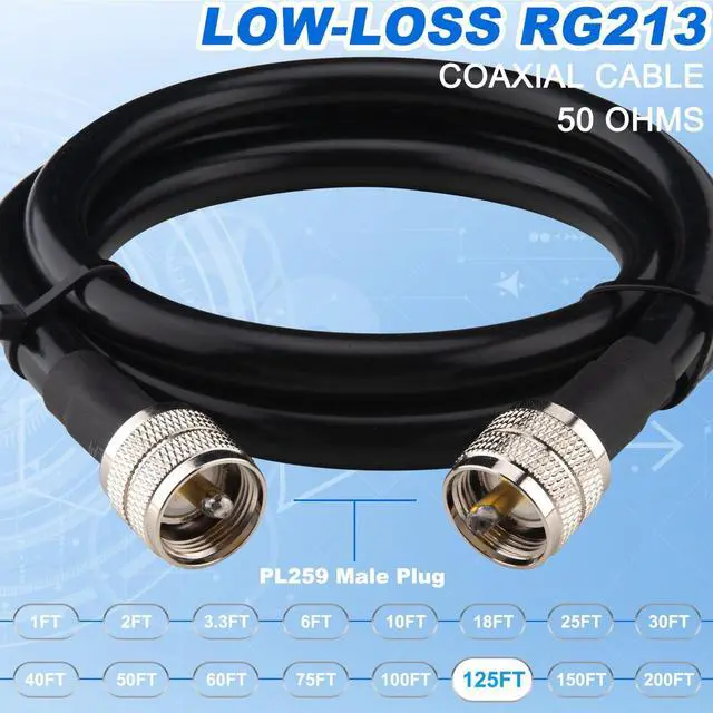 • Type- RG213 coaxial cable w/PL-259 connectors, Cable Length: 125 feet(38.1m), Impedance: 50-ohm, Protection: Heat-shrink tubing on both ends to keep out contaminants.