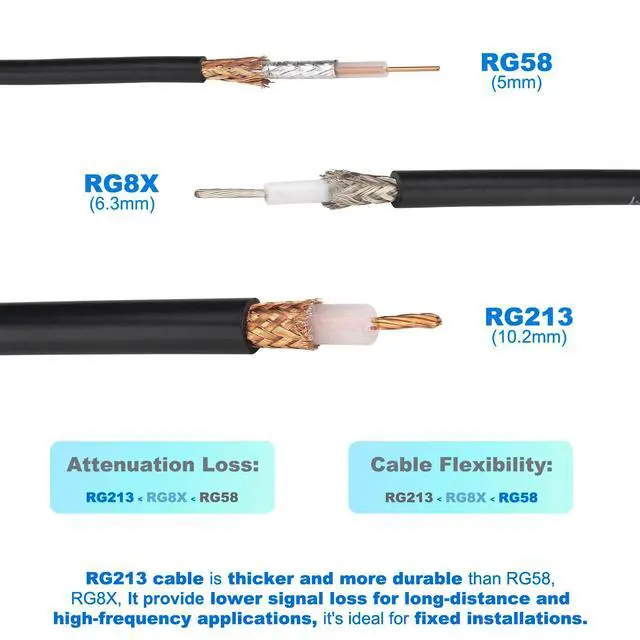 • Ultra-Low Loss- RG213/U cable has much lower loss than common thinner cables like RG58/RG8X. It only loses 4.42dB per 100 feet at 400MHz, with a VSWR of 1.25 or less, making it ideal for long-distance and high-power RF signal transmission or reducing loss.