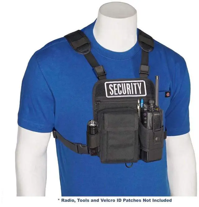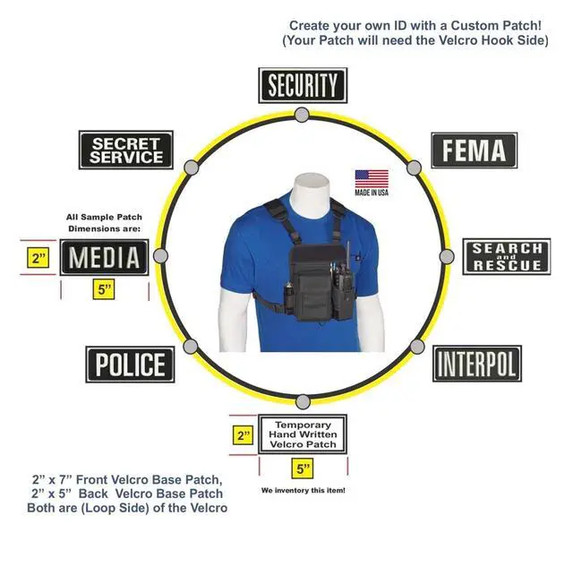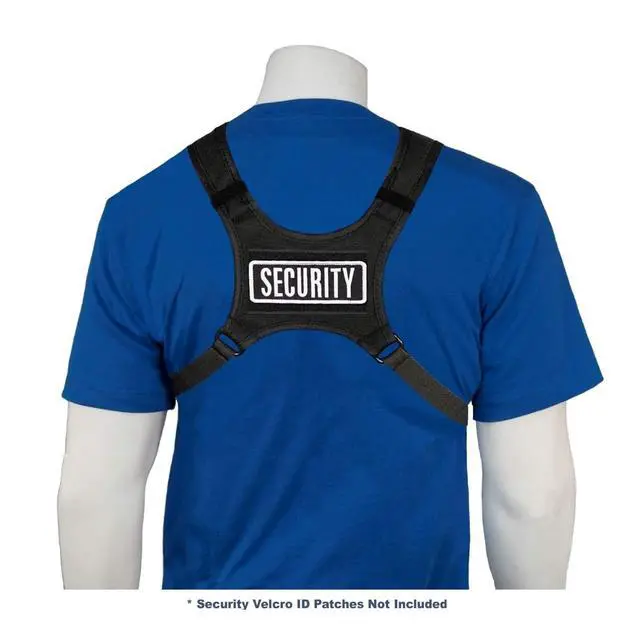 The Patent pending RCH-601P (Pro) is designed to create a system which quickly provides identification and professionalism for yourself and other members of your group. It has the same overall features as the RCH-601, but the RCH-601P Radio Holster has two Velcro Base Patches sewn onto the front and back of the radio chest harness. These base patches allow you to place custom identification patches on some or all members of your group. The universal sizing radio pouch is capable of handling just about any medium to large hand-held two-way radio on the market. Fully adjustable to fit both men and women.