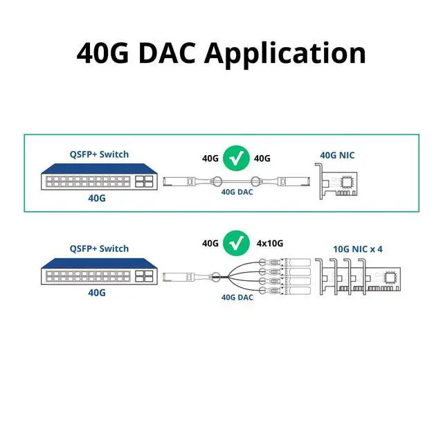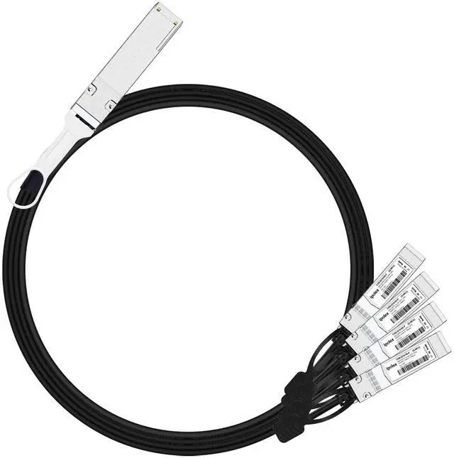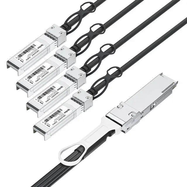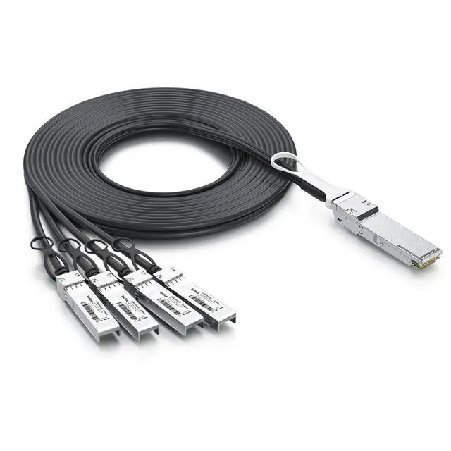 QSFP+ to 4x SFP+ breakout copper DAC cable, it's an application for the link with 40Gb/s rate switch to 4 upstream 10Gb/s devices. bridge the gap between your 10G and 40G capable switches/host adapters. This breakout cable complies with SFP+ & QSFP MSA and supports 10G/40G Ethernet standards.