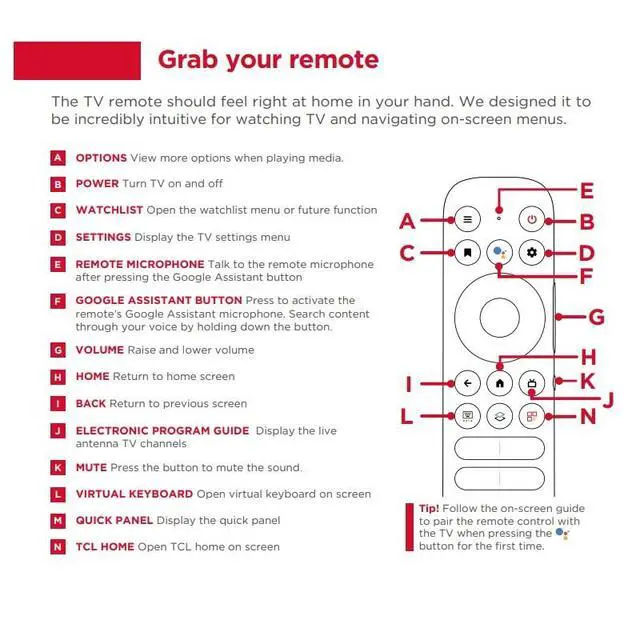 UHD LED Smart TVPairing Steps: 1. In Google TV mode, press and hold the HOME and OK buttons on your remote at the same time. 2. Keep your remote within 3 ft. of your TV during the pairing process. Compatible with