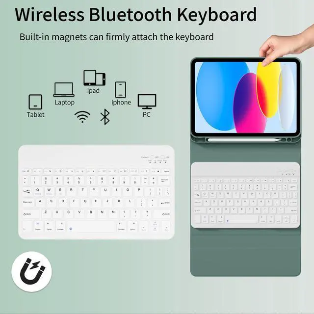 • Bluetooth Keyboard for Comfortable Typing: For iPad 10th generation keyboard case with lightweight design. The magnetic wireless keyboard is attached to this iPad cover with keyboard magnetically (supporting iPad/Android/Windows), let your iPad instantly become a portable laptop, perfect for working, typing, editing or watching videos, greatly improved your iPad productivity