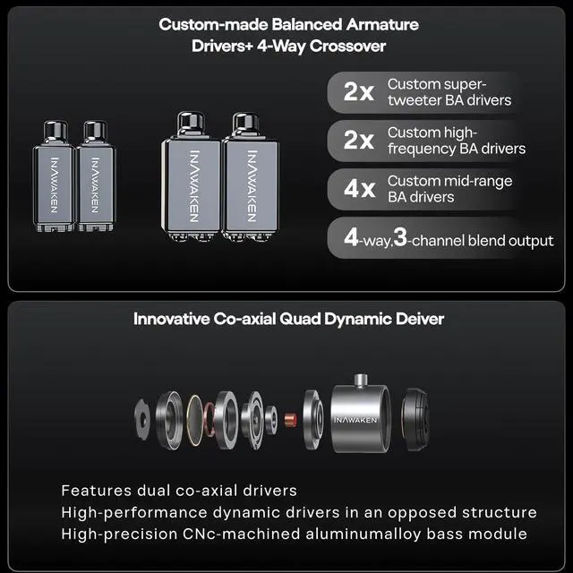 - Twilight-DS' s low-frequency system relies on two co-axially counter-oriented dynamic drivers-positioned in an opposing setup to boost dynamic range. Housed in a single, high-precision CNC-machined aluminum alloy bass module, these dual drivers serve up richer, more natural bass that hits with impact without muddling details. This also ensures all four drivers perform consistently, cutting down on non-linear distortion for cleaner, more reliable low-end ^^ - Complementing its driver core are 8 custom balanced armature (BA) drivers. Two act as super-tweeters for crystal-clear ultra-high frequencies, another two handle highs for crisp, non-harsh detail, and the remaining four refine mids to add natural warmth to vocals and instrument timbres.