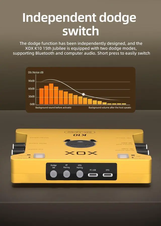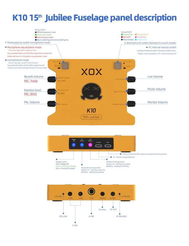 This sound card is suitable to live streaming, gaming, recording and dubbing, chat K song, teaching with PC/smartphone. In addition, it can also be used as an extended audio card for computer or game playStation, providing a separate microphone and headphone volume adjustment knob to replace the traditional PCI card slot sound card. (Not suitable for professional musicians. ) ^^ Wired OTG connection The XOX K10 15th Jubilee is equipped with an independent OTG interface, which can be connected to a phone using a dedicated OTG cable, and can also be connected to a computer to play accompaniment and assist in live streaming.