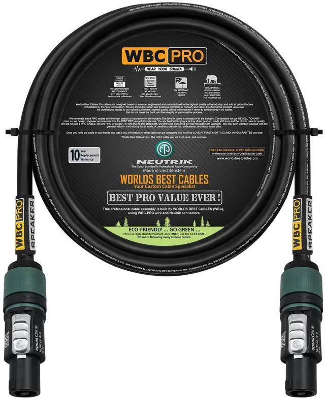 These high-value, high-quality cables will not break your bank and the integrity of your creative process. With WBC-PRO you are buying a product made with love and the utmost care for quality. WBC-PRO, the only cable you will ever need! ^^ The brand of connector used for this cable assembly: NL4FXX-W-S is the latest & the highest-end four-pole SpeakON offering by Neutrik AG- Liechtenstein, the world's leading brand for professional audio connectors. It sports a reliable twist-locking system, thermoplastic housing & Silver-plated Copper-alloy connectors. Offering the most reliable loudspeaker connections, the plugs can support 6mm to 12mm wide cables & have an IP20 rating. ^^ All our cables are professionally soldered using WORLDS BEST CABLES proprietary 4% silver solder blend & a nitrogen-assisted soldering process unique to us, exceeding industry standards, improves integrity of solder joints over traditional methods. ^^ These cables are lovingly assembled by WORLDS BEST CABLES, we offer the largest array of custom-built cables in the market, we carry all the major cable and connector brands. We have served millions of customers with quality assemblies for many years - this sale is for a single 6 Foot long cable.