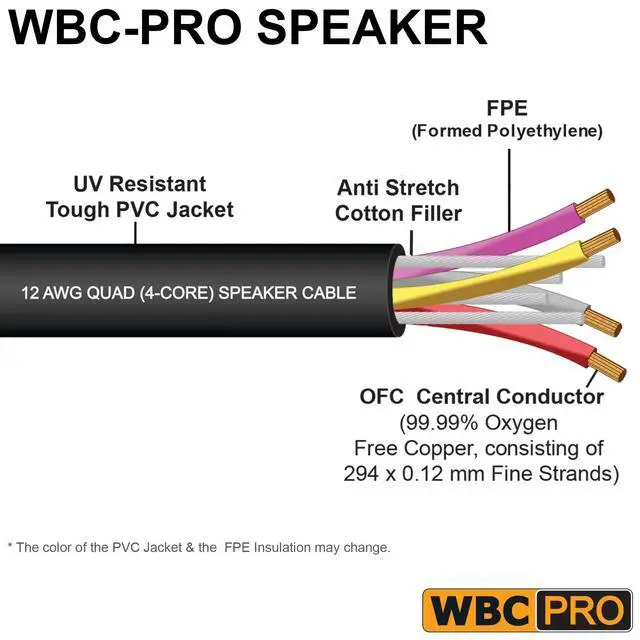 WBC-PRO-SPEAKER-12AWG, Star-Quad (eliminates EMI noise), Ultra-flexible, Professional-grade cable is a top-of-the-line solution for super-durable speaker cables. Low Capacitance & Resistance are ideal for long cable runs while still delivering Higher-Highs and Deeper-Lows. The cable sports 294 x 0.12 mm High-Purity ( 99.99 %) Oxygen Free Copper (OFC) Strands per Core. Suitable for even the most demanding situations (UV Protected Tough PVC Jacket) & superior to Industry leaders like Canare 4S11. ^^ WBC-PRO cables are designed based on science, engineered & manufactured in-house to the highest quality in the industry, and sold at prices that are unbeatable by the pro competition.