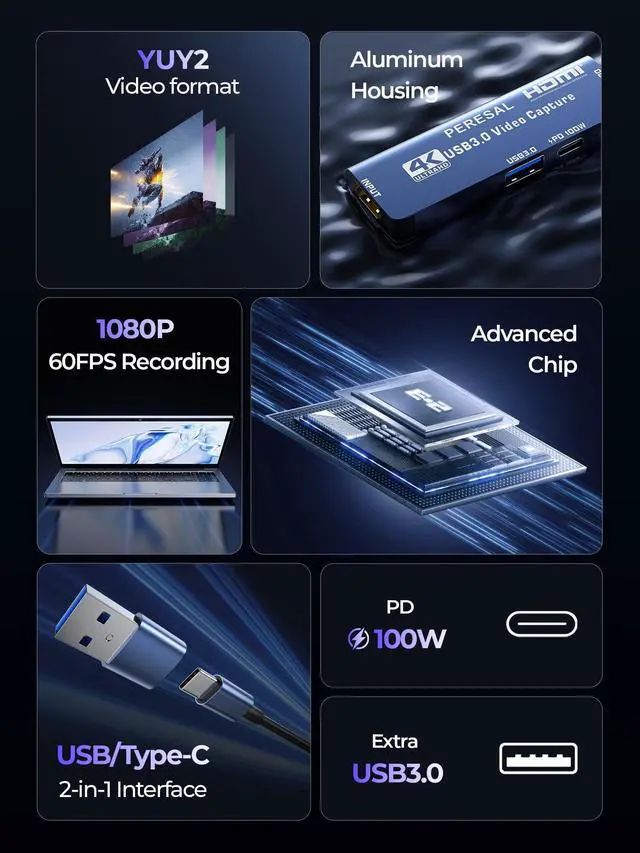 Up to 4K Streaming Game Recording PERESAL USB Capture Card with 60in HDMI Cable supports up to 4K@60Hz input and 19201080@60Hz output resolution, Plug and play. Ensuring smooth, lag-free performance to meet the needs of professional creation ^^ 100W High Speed ChargingThrough PD 3.0 technology, PERESAL video capture card supports 100W fast charging, you can use it to power your capture device such as laptop, ipad, say goodbye to the worry of no power. (PD charging only supports USB C port charging and does not support USB 3.0. USB 3.0 port only support mouse and U disk) ^^ Extra USB Port for Laptop This USB 3.0 video capture card is designed with both USB A and USB C dual interfaces, it can support connecting USB Mouse, Keyboard, U-disk and other USB devices.