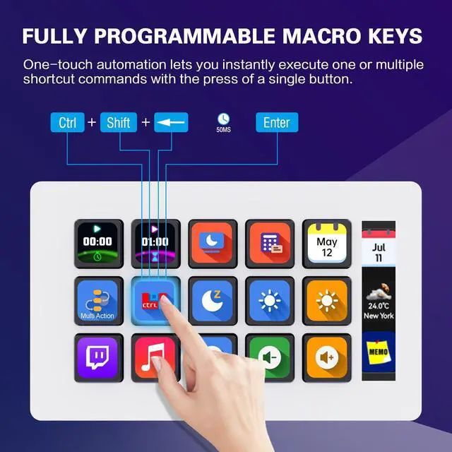 It works seamlessly with popular software such as OBS, PowerPoint, YouTube, Twitter, Discord, Excel, Word, Photo shop, Adobe Premiere Pro, and more, making your work even smoother. ^^ Multifunctional to meet your needsThis macro shortcut keyboard's application space offers hundreds of plugins such as schedule reminders, clocks, stopwatches, weather, calendars, etc., making it not only a productivity tool but also a great desk accessory. In addition, 60 types of icon packs are available for you to download and use according to your needs.