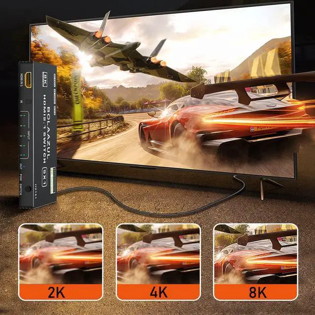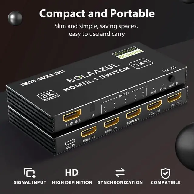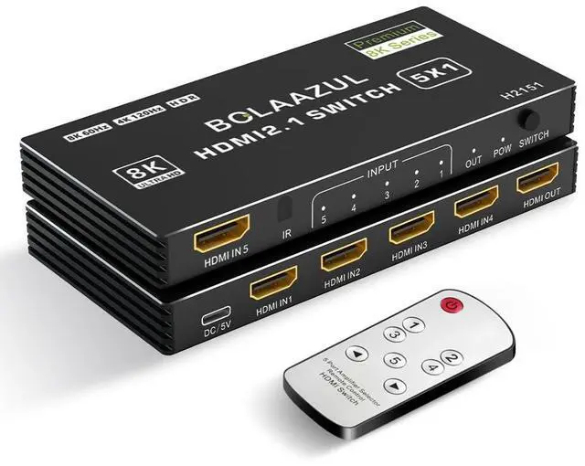 Switch 5 in 1 out: The BolAAzuL's H2151 is a 5-port HDMI 2.1 Switch and you can connect up to 5 HDMI 2.1 video sources such as Xbox series X, and PS5 to a single Display ^^ 4K@120Hz