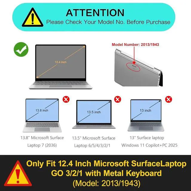 COMPATIBLE WITH: ONLY Fit For [ 2020-2023 Release ] Microsoft Surface laptop Go 3 / 2 / 1 12.4 inch Case with Liquid Retina display and Touch ID [ Model 1943, 2013 ], he case is NOT compatible with any other Microsoft Surface models.