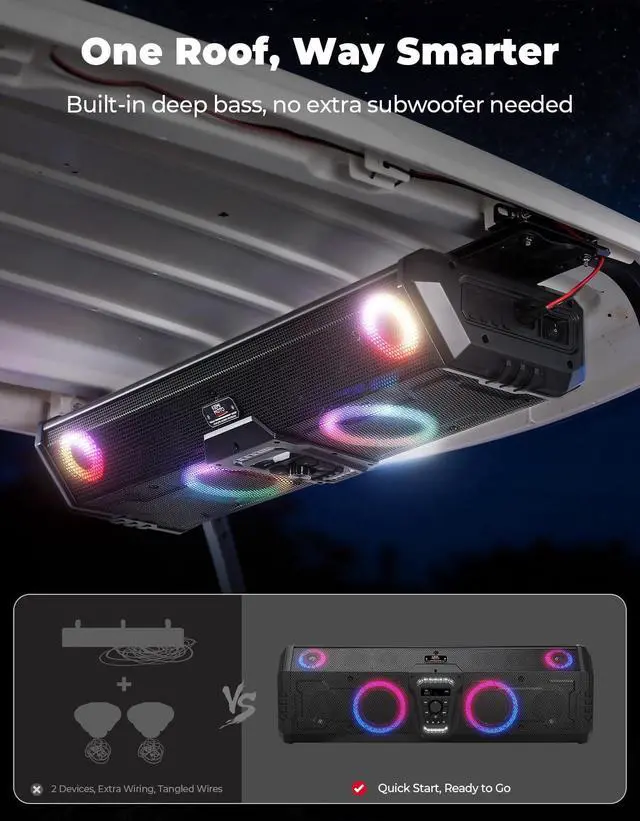 Dynamic RGB & Reading Light: Command the vibe of your entire ride in LED lights and music. Paint your adventures with light using 230+ dynamic RGB modes that pulse and flow to the rhythm of your music. Then, with a remote control, switch to "DOME" mode for a brilliant white camp mode to instantly create a perfect, functional reading light for maps, gear, or campfire conversations after the sun goes down ^^ FM Built for