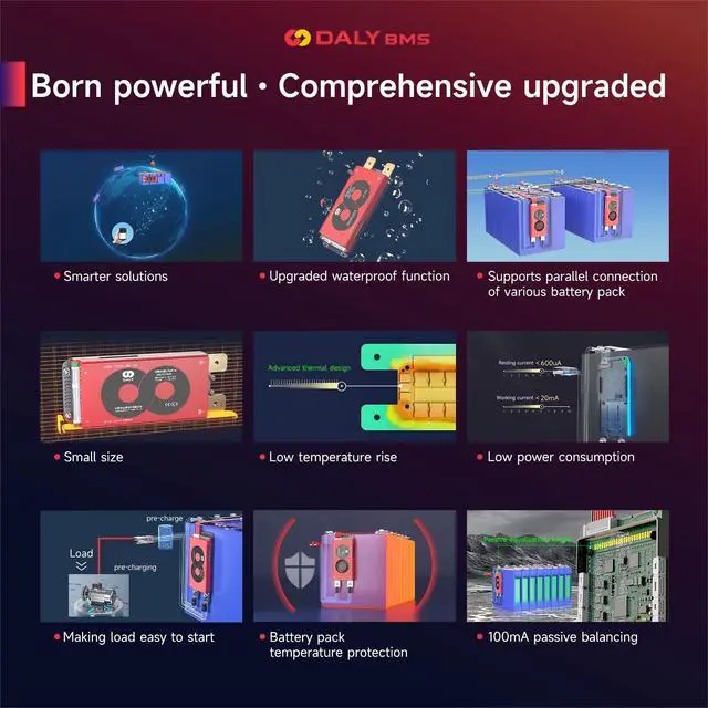 ^^ Strong Overcurrent Capability: To solve the regenerative current problem of golf carts, DALY BMS uses high-performance MOSFET and high-power TVS in hardware to quickly absorb surge voltage and control regenerative current to protect BMS and batteries. The software features optimized absorption and release logic to avoid power off issues caused by regenerative current.