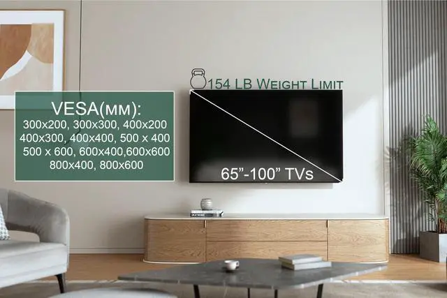 ^^ Effortless Installation Process: Simplify your setup process with the wall mount designed for routine install ease; with VESA 300x200, 300x300, 400x200, 400x300, 400x400, 500x400, 500x600, 600x400, 600x600, 800x400, 800x600 compatibility, mounting a massive 98 inch TV is hassle-free. Avoid the frustration of complicated setups and enjoy seamless installation that lets you spend more time enjoying your new cinematic experience and less time dealing with user manuals.