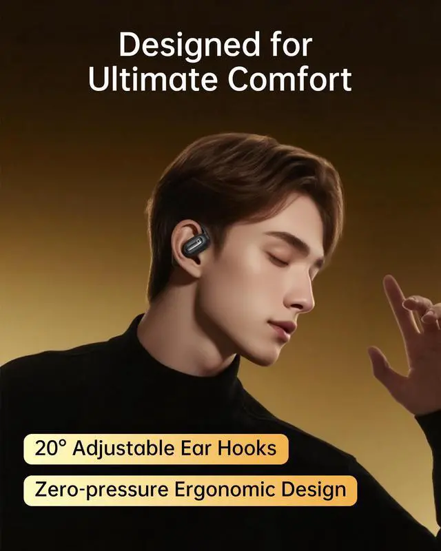 Comfort Redefined: FeatherLight Open-Ear DesignThe Skin-Friendly silicone wrapped memory titanium alloy hooks mold to your ear anatomy with 0.3N clamping force. At just 10g per bud, the open-ear design eliminates pressure points while staying secure during marathons or HIIT workouts. Hear your surroundings clearly for safer outdoor adventures. ^^ Immersive Yet Aware Sound ExperienceEnjoy premium sound quality without sacrificing situational awareness. Effective reduction of call noise by over 99%. Our advanced acoustic technology delivers rich, balanced audio while keeping environmental sounds clear. Perfect for cyclists, runners, and professionals who need to stay alert. ^^ Sweatproof Durability & Intuitive ControlThe IPX5-rated build withstands tough workouts and unexpected weather. Easy-to-use touch controls put playback, calls, and voice assistants at your fingertips without interrupting your activity. Designed to keep up with your most demanding days.