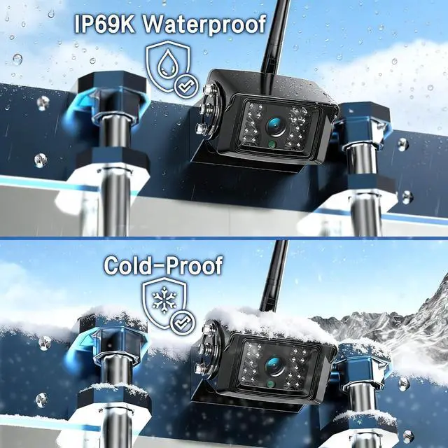The 120 wide-angle rear camera and two side cameras provide full coverage of your surroundings. Switchable parking guidelines make reversing and parking effortless. ^^ Special CompatibilityThis wireless system allows you to monitor up to 4 cameras simultaneously for complete blind spot coverage. It offers compatibility with three camera types: 12V DC Cameras for permanent power (included in kits), Battery Magnetic Cameras (not inclued, ASIN: B0DXF1R8KM / B0DXF1CCGP), and solar cameras (not inclued, ASIN: B0G1S9MZMK). This flexibility lets you freely mix and match cameras to build a customized monitoring system that perfectly adapts to your needs. ^^ IP69K Waterproof & Loop Recording Built to withstand rain, snow, and fog, the wireless backup cameras offer reliable performance in all weather conditions. With loop recording functionality, the system automatically overwrites the oldest footage when the memory card is full, ensuring continuous protection. ^^ 30-min InstallationExperience the convenience of a wireless video signal without the hassle of running long cables from the camera to the monitor.