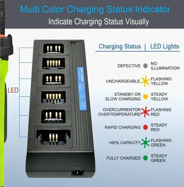 Charging Status Indictor: Each LED indicator can give out light at six mode (red, flashing red, yellow, flashing yellow, green, flashing green) which let the users know real-time charging status and battery conditions, such as rapid charging status, 80% capacity status, full charge status, stand-by status, over-heat status, unchargeable status and more.