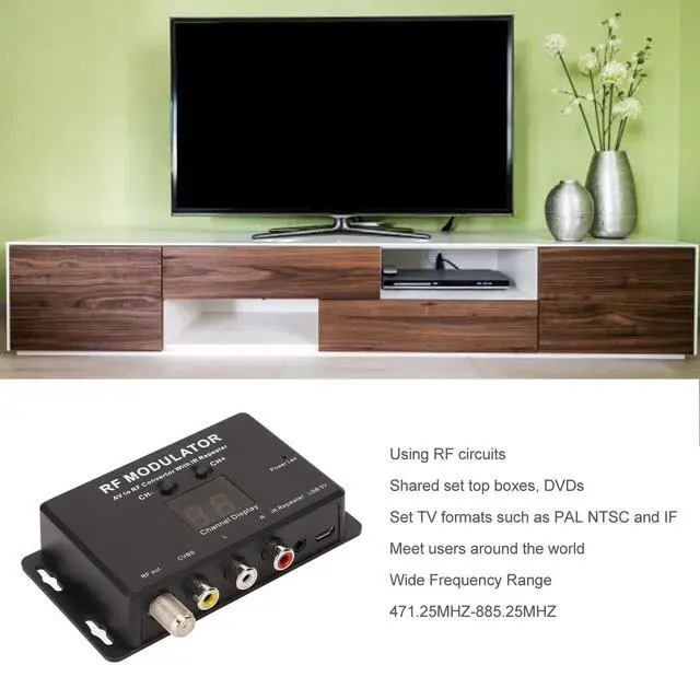 Applicable: AV to RF TV modulator is suitable for global or external setups using NTSC PAL B G, 1, D K, L M N TV formats.