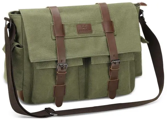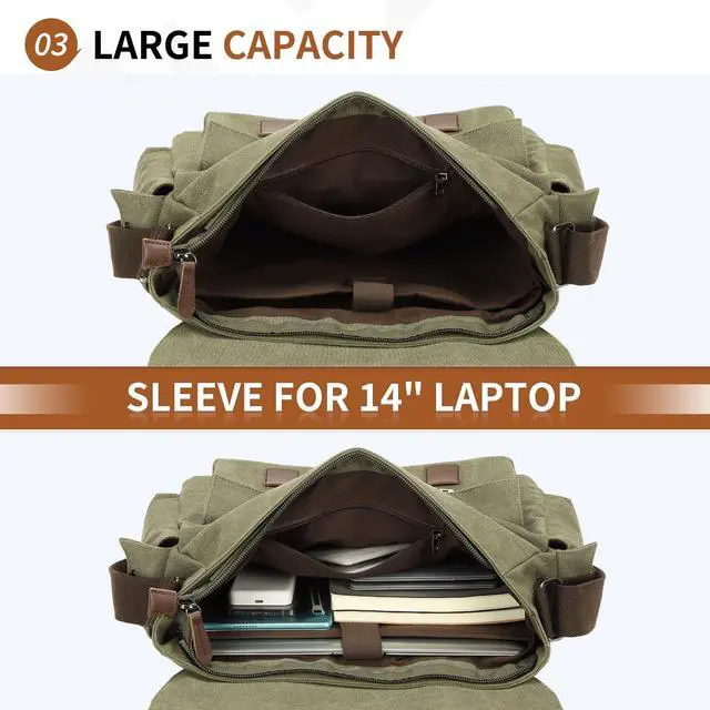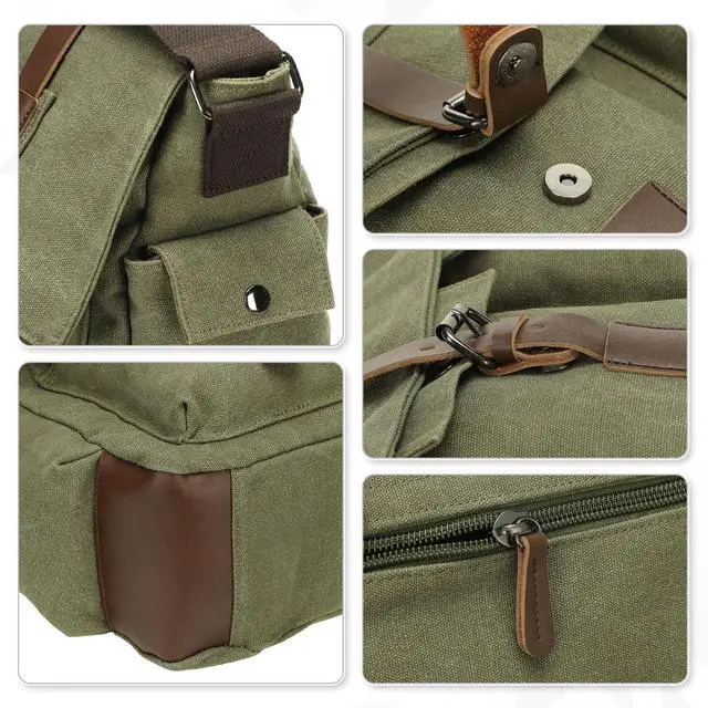 Description-Durable Construction- --Crafted from premium canvas with PU leather accents, this vintage crossbody bag is built to last. Reinforced stitching and antique-style iron hardware ensure long-term durability and timeless style-Classic Vintage Design- --Features a timeless flap closure with leather straps and buckles, offering a retro aesthetic that complements any outfit. Perfect for those who love vintage style-Ample Organized Storage- --Includes a secure zippered main compartment with a dedicated sleeve for 13-inch laptops, two front flap pockets, a back zipper pocket for valuables, and side pockets for small essentials like keys or smartphones-Comfortable and