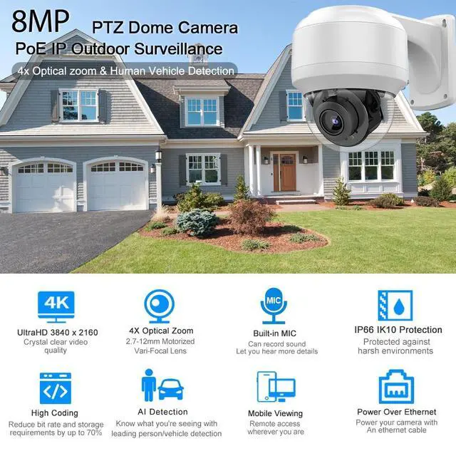 range: 0 ~ 90. Equipped with 2.712 mm AF lens help you get wide viewing vision. Enable to zoom in and out to see more detail of distant objects, without impairing image quality. Pan and tilt via phone/tablet/PC, offering a wide field of veiw. ^^ 164ft IR Night Vision &Built in MicDarkness will not blind this PTZ camera outdoor. Advanced night vision with 2pcs high performance infrared array LED lights extend the at night viewing distance to 164ft, The camera passed a series of rigorous tests on dust and moisture. Built-in Mic allow you to hear the people in front of the camera no matter where you are ^^ Smart Detection Camera & Power Over Ethernet This 4K PoE camera is advanced human/vehicle detection based on cutting-edge detection algorithms helps identify real threats, and when an alarm occurs, the camera captures it in time and sends an alarm message to your phone, the accuracy rate is up to 98%. Powered by Ethernet, and only one Ethernet cable is needed for power and data connection, which simplifies installation and reduces wiring costs. ^^ H. 265+ coding & IP66 Weatherproof The latest H.