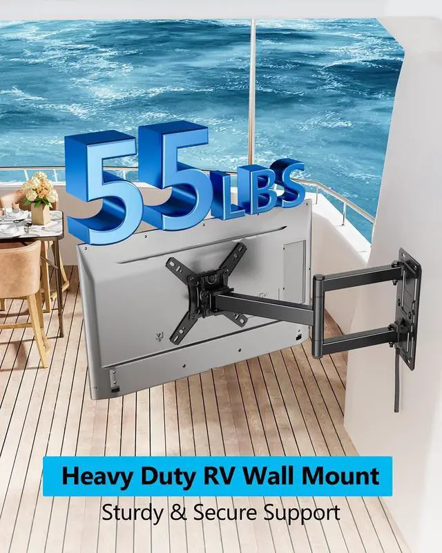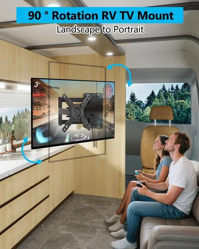 RV TV Mount: The Full Motion RV TV Wall Mount is designed for faceplate to rotates +/-90 for landscape and portrait orientationcan, and every shafts can swivel left or right 180 to cover different seats in your room, It also tilts 12 down/5 up to reduce glare and allow for more comfortable viewing angles. ^^ Stable and Durability - This Lockable RV TV & Monitor Mount for RV is constructed of high-quality steel to make it incredibly durable for long-lasting performance. With a weight capacity of up to 55 lbs, the RV TV mount is designed to securely hold your TV and Monitor for ultimate peace of mind and the lockable design reduces arm vibration when in transit. ^^