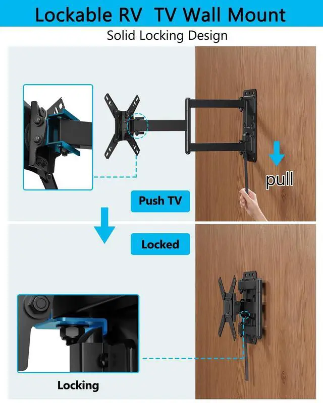 Locking Mechanism Design: The RV TV wall mount features a pull cord locking mechanism that keeps your TV steady and stableeven on rough terrain. With just a pull of the cord, the highly reliable lock can easily be quick released to extend the TV out when parked, - Locking mechanism of RV mount secures swivel arms and TV plate at one time when vehicle in motion to prevent any bumps. Easily lock and release your TV with the pulling strap. ^^ Landscape to portrait
