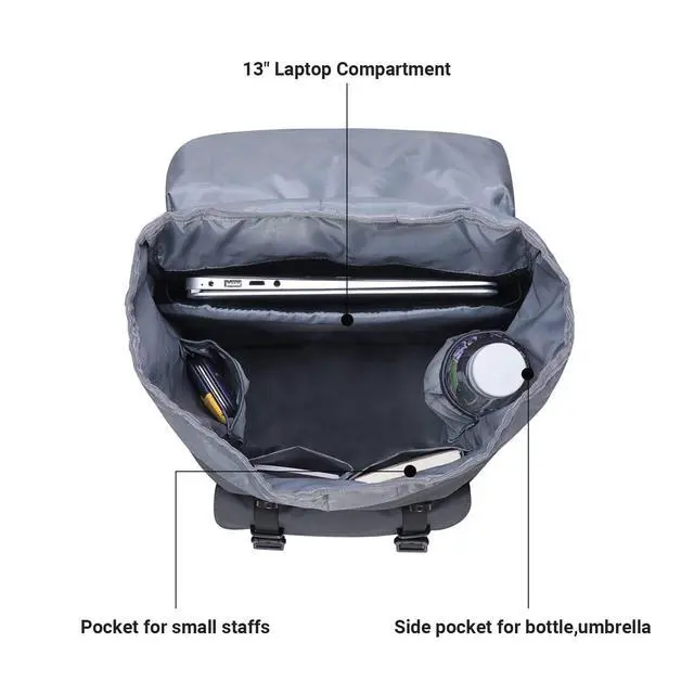 Capacity: 19.7L. Laptop compartment can fits up to 14" Laptop, while the outer compartment can hold 15". 1 main compartment+ 1*outside zipper pockets+ 2*inside pockets+2*side pockets. Tablet, Macbook Air/Pro, ipadphone, pen, notebook, wallet, umbrella, books, folders, or other things can be easily put in the bag.