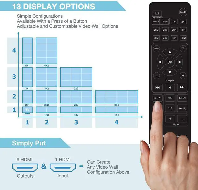 Plug & Play: No driver needed. Edge Masking supported. ^^ 13 Display Modes - 1x2, 1x3, 1x4, 2x1, 2x2, 2x3, 2x4, 3x1, 3x2, 3x3, 4x1, 4x2 provide extra diversities on the display options.