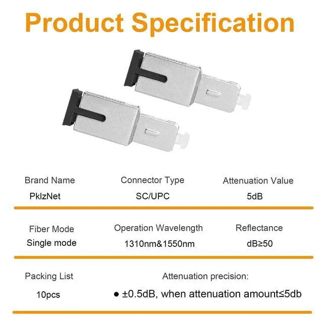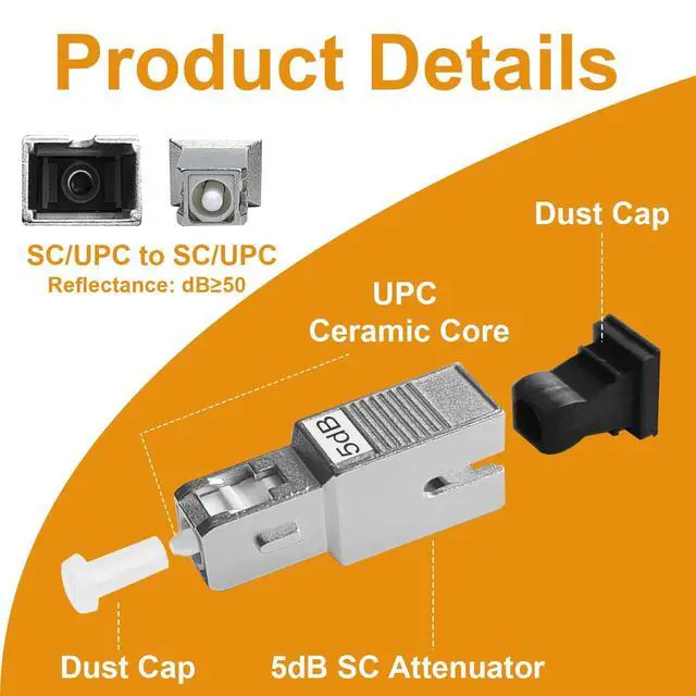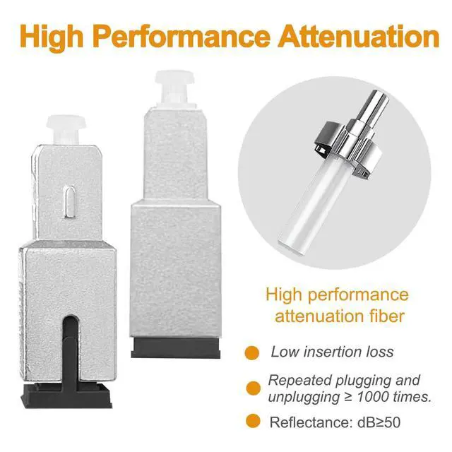 Connector TypeWith 5dB attenuation amount, SC-UPC female to SC-UPC male attenuator made of high-performance attenuated fiber. ^^ Product FeaturesThe feature of the product is that the optical attenuator is widely applied in fiber optic communication system, having characteristics like high precision, strong impact resistance and stable and reliable performance. ^^ Good PerformanceSC UPC Fiber Optic Attenuator: With high-precision attenuation of 0.5 % dB, polarization related loss 0.2 dB, and return loss 50dB, it maximizes signal integrity and transmission stability. ^^ Plug and PlayThe fiber optic attenuator is easy to install, and its component structure is simple, facilitating easy assembly and safe storage, and the flexible and convenient plug and play enables you to complete the task more efficiently. ^^ Product ApplicationWidely used in fiber optic communication, fiber optic testing equipment, fiber optic cable television, etc. Usually used for debugging fiber optic instruments, attenuation of fiber optic signals, etc.
