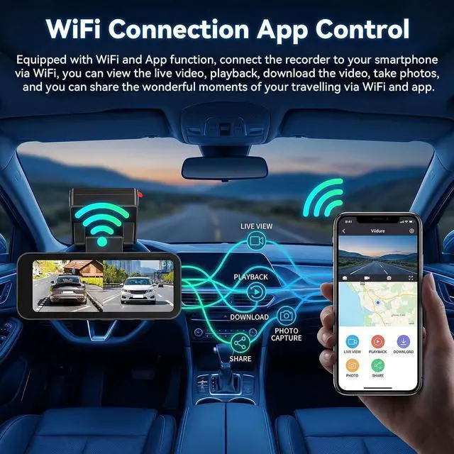 WiFi &Wireless App Control: The dash camera for cars features built-in WiFi, allowing you to instantly view and manage recordings on iOS or Android devices via the Viidure App. Easily download recorded videos/photos to your phone at high speed, and share them on social media, with friends, family, or insurance companies