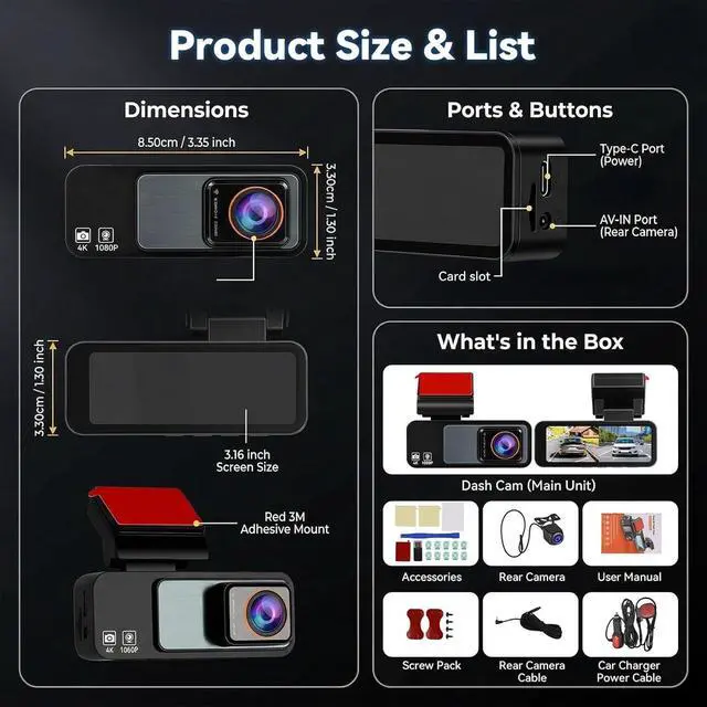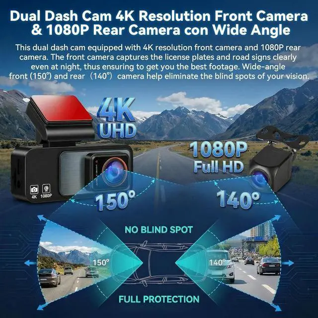 Ultra HD 4K Front + 1080P Rear Recording: The dash cam supports dual-channel simultaneous recording, capturing both front and rear footage, ensuring clear footage of the road ahead and behind. The front camera features a 170 ultra-wide-angle lens, providing full coverage of six-lane roads and capturing more road details with this 4K dash cam