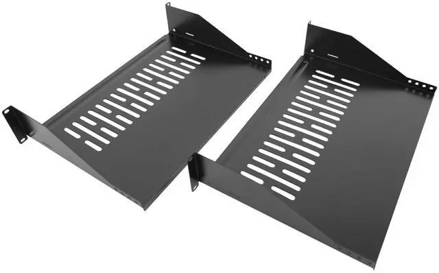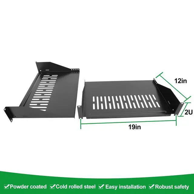 The 2U vented server rack mount shelf is 12-Inch, 2U shelf for almost any standard 19in server rack or cabinet with front mount options. Its versatile design ensures it works great for all your computer, AV, network and data equipment needs. Added Ventilation this vented cantilever shelf helps to improve air flow and lower temperatures in the rack, ultimately helping to extend the life of your equipment and keep it safe. Heavy-duty Construction Constructed using grade cold-rolled steel, this durable fixed rack shelf can hold up to 80 lbs of equipment, The rugged steel construction holds up to even the harshest industrial environments, helping to keep your equipment safe.