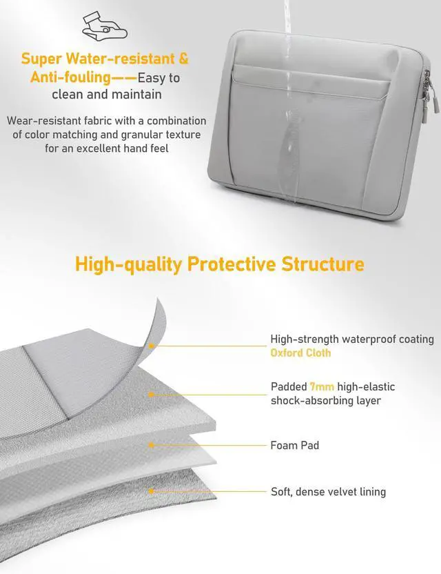 Superior Protection: It uses high-strength Oxford cloth with waterproof coating, which is super water-resistant, wear-resistant and oil-resistant. The interlayer uses thick and high-elastic shockproof material to protect your laptop in all directions ^^ 360