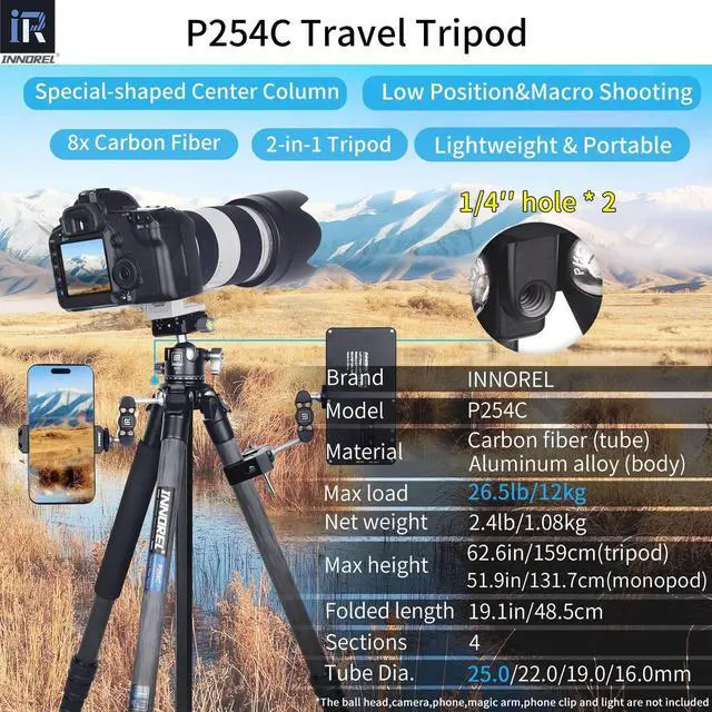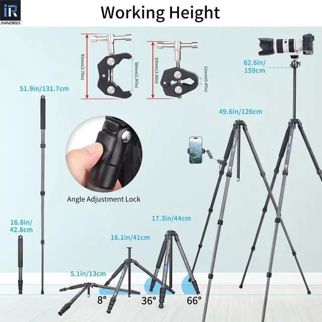 A carrying bag also included for easy travel. ^^ LOW POSITION & MACRO SHOOTINGThe long special-shaped center column can be inverted to take macro photos, besides it comes with a shorter center column, after installing it, you can get the lowest height of 5.1 in/13cm. All the three legs can be adjusted to three angles(8/36/66), you can get a more suitable height by putting out tubes' buckle. ^^ PACKAGE There is a tripod bag, P254C tripod, three stainless steel spikes, an allen key, a short center column, a super clamp (a gift) in the package.