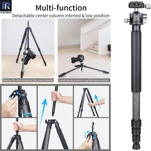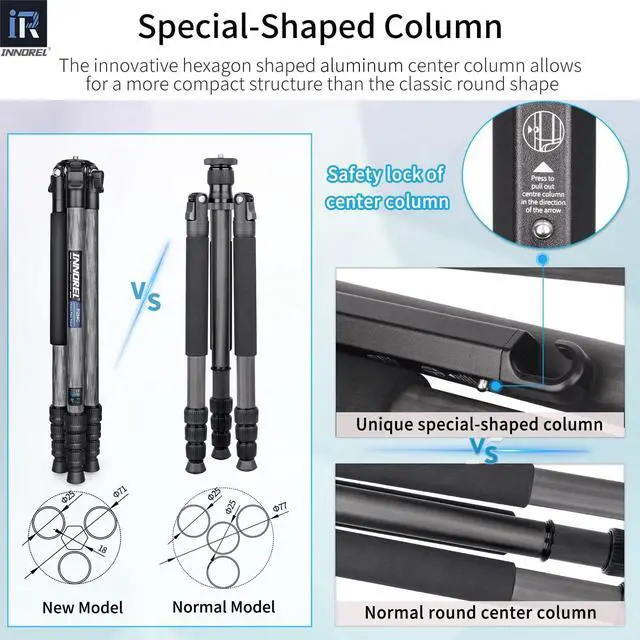 HIGH QUALITY & PORTABLEMade of genuine 8 layers carbon fiber, the tubes are lighter and stronger. The structure of this tripod is compact, the folded length is only 19.1 in/ 48.5 cm so it is easy to carry and suitable for travel. Other main parts are made with CNC and Anodic Oxidation technology, which make the surface much better and smoother, the color of tripod more well-distributed and exquisite. ^^ SPECIAL-SHAPED CENTER COLUMNThe tripod adopts innovative special-shaped center column design that is more compact than the classic round shape. This unique hexagon shaped center column can save more space.