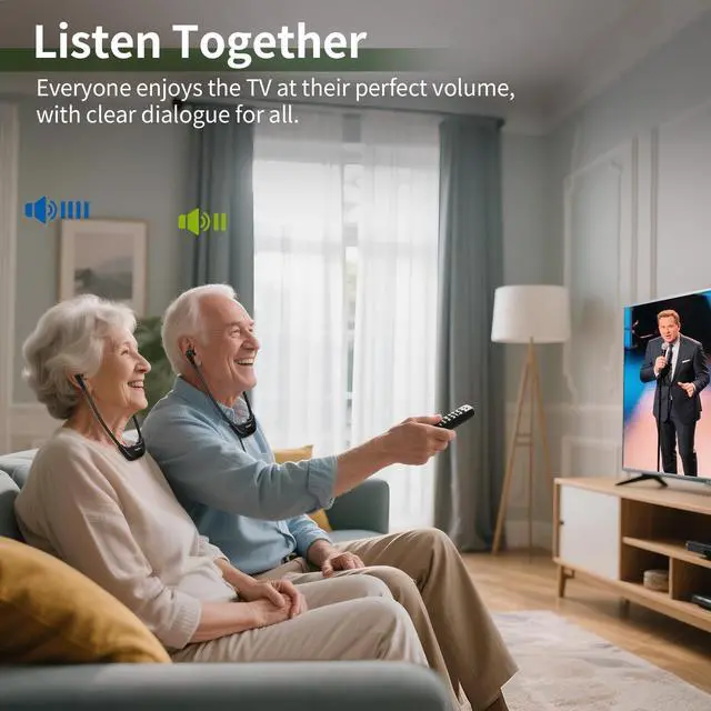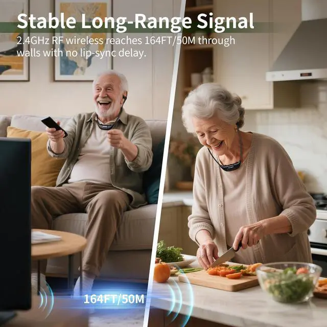[Hear Every Word, Share Every Show] No more missing dialogue. These in-ear wireless TV headphones use voice-enhancing technology that highlights speech and reduces background noise. With dual headphones in one set, you and a loved one can enjoy crystal-clear sound together, perfect for seniors or anyone who struggles to catch every word. ^^ [No Li-Sync Delay, Whole-Home Coverage] Watch TV in real time with 2.4GH z wireless TV headphones. The stable RF connection delivers perfectly synced sound up to 164FT, even through walls. Great for watching from the bedroom, kitchen, or another floor - while still staying connected to your favorite shows.