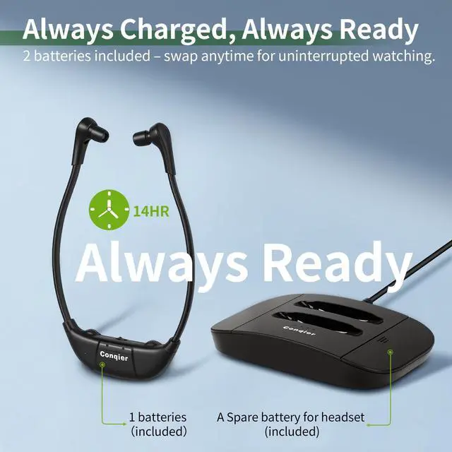 ^^ [Personalized Hearing for Each Listener] Everyone hears differently. Each headset has its own controls for volume & tone adjustment (dialogue/standard/cinema), left/right balance, and mono/stereo mode. Ideal TV headphones for seniors, couples, or family members with different hearing needs, each person sets the sound the way they like it. ^^ [All-Day Viewing with Extra Battery] The set includes a spare battery in the base. While you use one, the other charges in the base station, providing up to 14 hours of play. Plus, Ambient Sound Mode lets you hear conversations or doorbells without removing the headphones for TV watching.