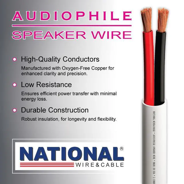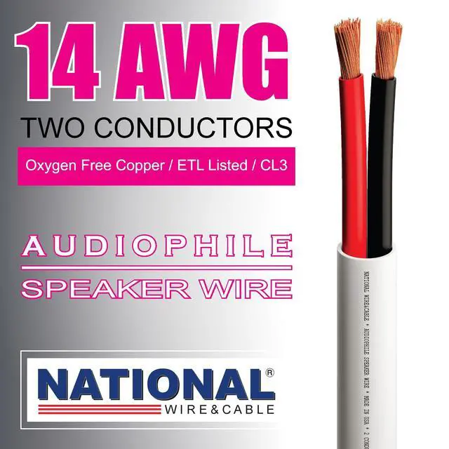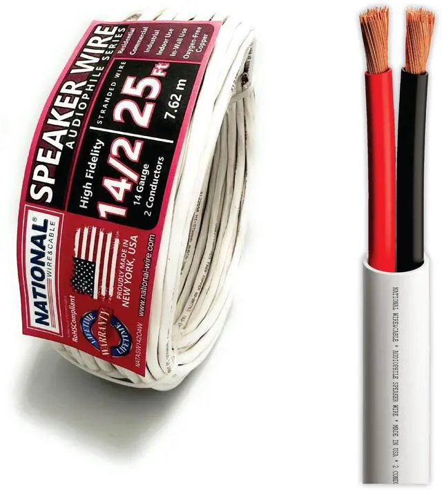 NATIONAL Wire&Cable - 14/2 Audiophile Speaker Wire (25 Feet) 14AWG Gauge - Made in USA - in Wall Audio Speaker Wire Cable/CL Rated/ETL Listed / 2 Conductors - OFC Oxygen-Free Copper, White 25ft