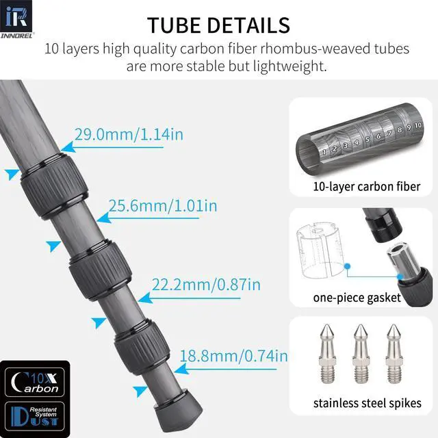 LIGHT & ROBUSTThis tripod is made of metal and 10 layers carbon fiber with CNC technology and anodic oxidation, which is lightweight, robust and for long-lasting working or playing sessions. ^^ LOW GRAVITY CENTER The ballhead is designed with low gravity center and double U notch, the structure is more compact and reliable. CNC machining and 44mm/ 1.73 in large ball diameter make it extremely stable. ^^ HOLLOW & ANTI-LOSTN44 ballhead adapts hollow ball and anti-lost design, which make a weight reduction and people wont lose any knobs of it, solving the problem of losing small parts for you.