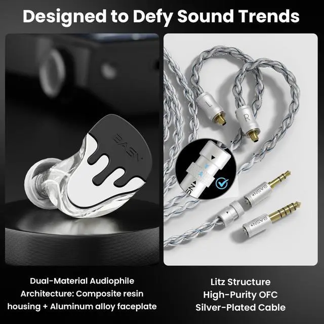 Precision Hybrid 6-Driver EarphonesNew BmasterX IEMs combines 1 dynamic driver (warm bass), 3 balanced armatures (rich mids), and 2 piezoelectric tweeters (ultra-detailed highs) delivers studio-grade sound, ideal for monitoring, mixing, and audiophile enjoyment ^^ Noise Isolation Pro IEMsFor musicians and audio professionals, these basn in ear monitors provide crystal-clear sound by blocking background noise and reduce interference and stay comfortable for hours. Ideal for musicians, singer, drummers, dj, audiophiles ^^ Pro Stage Monitor Earphonesbasn bmasterX built for musicians with resin housing and aluminum plate in an ergonomic design and 7 fit-tips for all-day comfort.