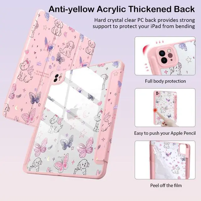 BlHMCASE Cute Kawaii Puppy Butterfly for iPad Air 11 Inch Case 7th/6th Generation (M3/M2) 2025/2024 with Pencil Holder, Auto Sleep/Wake, Pink Leather Clear Acrylic Back Cover