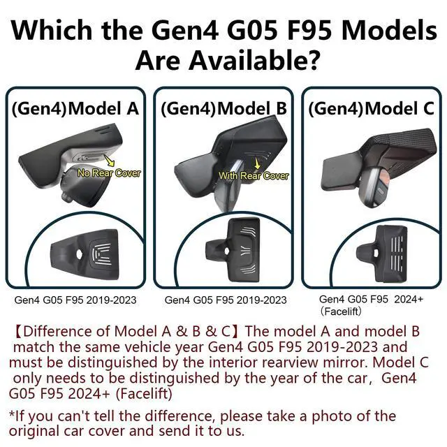 Difference of Model A & B & CThe model A and model B match the same vehicle year Gen4 G05 F95 2019-2023 and must be distinguished by the interior rearview mirror. Model C only needs to be distinguished by the year of the carGen4 G05 F95 2024+ (Facelift) ^^ Custom fit for BMW X5 Gen4 G05 F95Mangoal front 4k & rear 1080p dash cam can fit perfectly behind the rear view mirror like original. No messy wiring exposed, no complicated rewire at all. Perfectly intergrated with BMW X5 Gen4 G05 F95 2019 2020 2021 2022 2023 (Model B), X5 M M50i xDrive50i sDrive40i xDrive40i ^^ 4K Image and Ultra HD 2160P VideoUpgraded with f/ 1.8 big aperture lens and CMOS IMX335 chip to enable high-definition video at 2160P/30fps, Mangoal OEM style dash cam for can provide 4K image performance in all aspects.