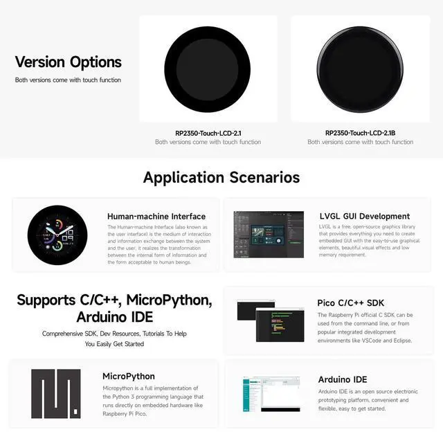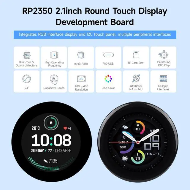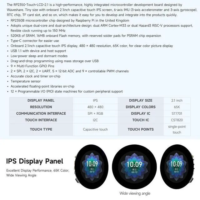 High-Performance RP2350 MCU: Features the Raspberry Pi RP2350B chip with a unique dual-core, dual-architecture design (ARM Cortex-M33 or RISC-V) running up to 150 MHz. ^^ Integrated 2.1 -inch